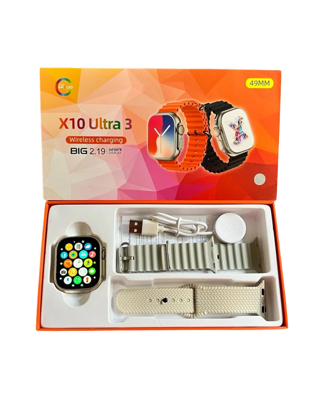 Smartwatch X10 Ultra 3 com display AMOLED de alta resolução, monitoramento contínuo de frequência cardíaca.