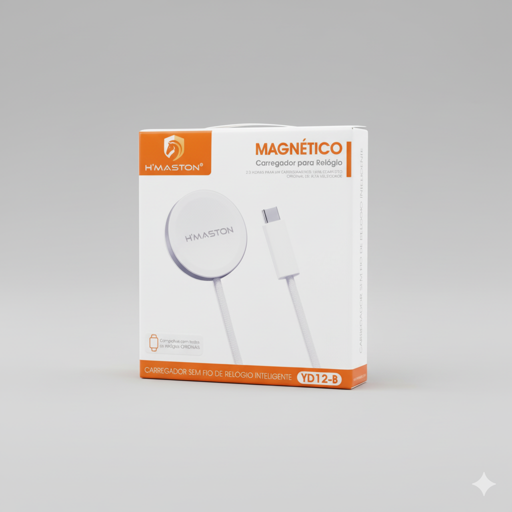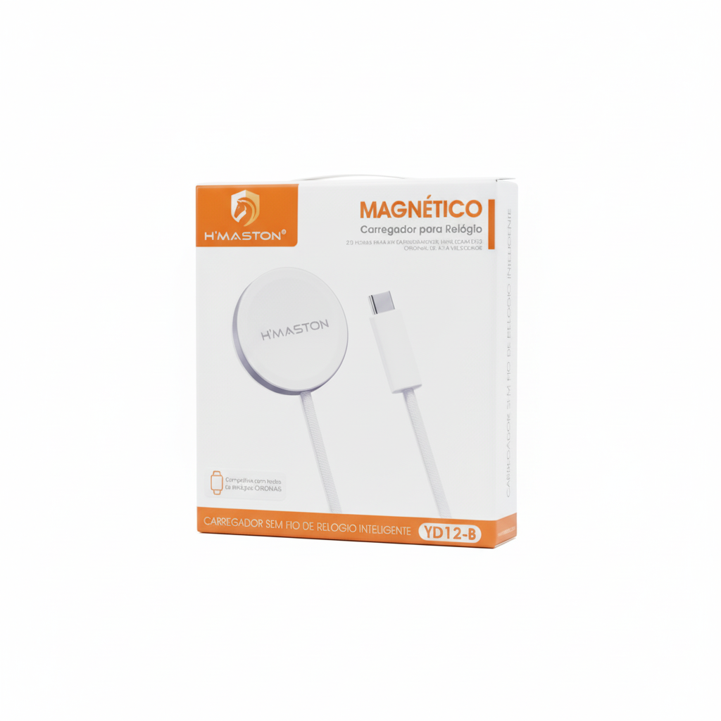 Design: Carregador magnético sem fio com design clean e minimalista, ideal para uso diário e fácil transporte. Possui base circular para o relógio e cabo integrado.